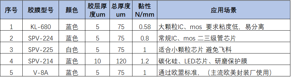 不同粘性和要求的藍膜,適用于不同的客戶,目前市場常見的藍膜以224和225為主。以日東藍膜為例,下表簡單介紹不同系列的藍膜及其應用。