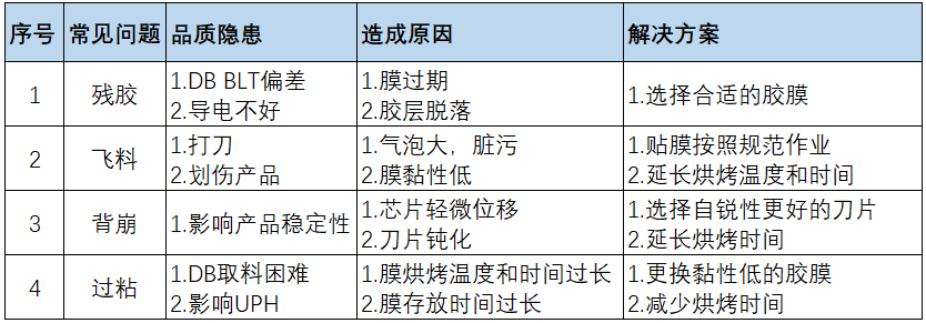 在封裝切割過程中,經常會遇到一些切割相關的品質問題,引起的原因很多,膜的選型不當也會造成品質問題,常見異常有:背崩,飛料,拉絲,殘膠,氣泡,沾污。這里主要從膜的角度去分析常見的異常和對應的處理方法。
