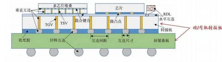 硅中介層有TSV的集成是最常見的一種2.5D集成技術,芯片通常通過MicroBump和中介層相連接,作為中介層的硅基板采用Bump和基板相連,硅基板表面通過RDL布線,TSV作為硅基板上下表面電氣連接的通道。