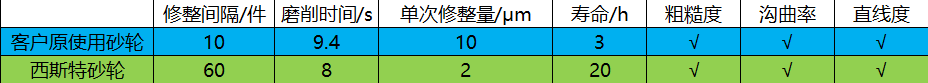 圖中可以看出,在使用了西斯特砂輪后,大大提高了用戶的修整間隔,減小了單次修整量,減少了單件加工時間,延長了砂輪的使用壽命。意味著客戶生產成本的降低。